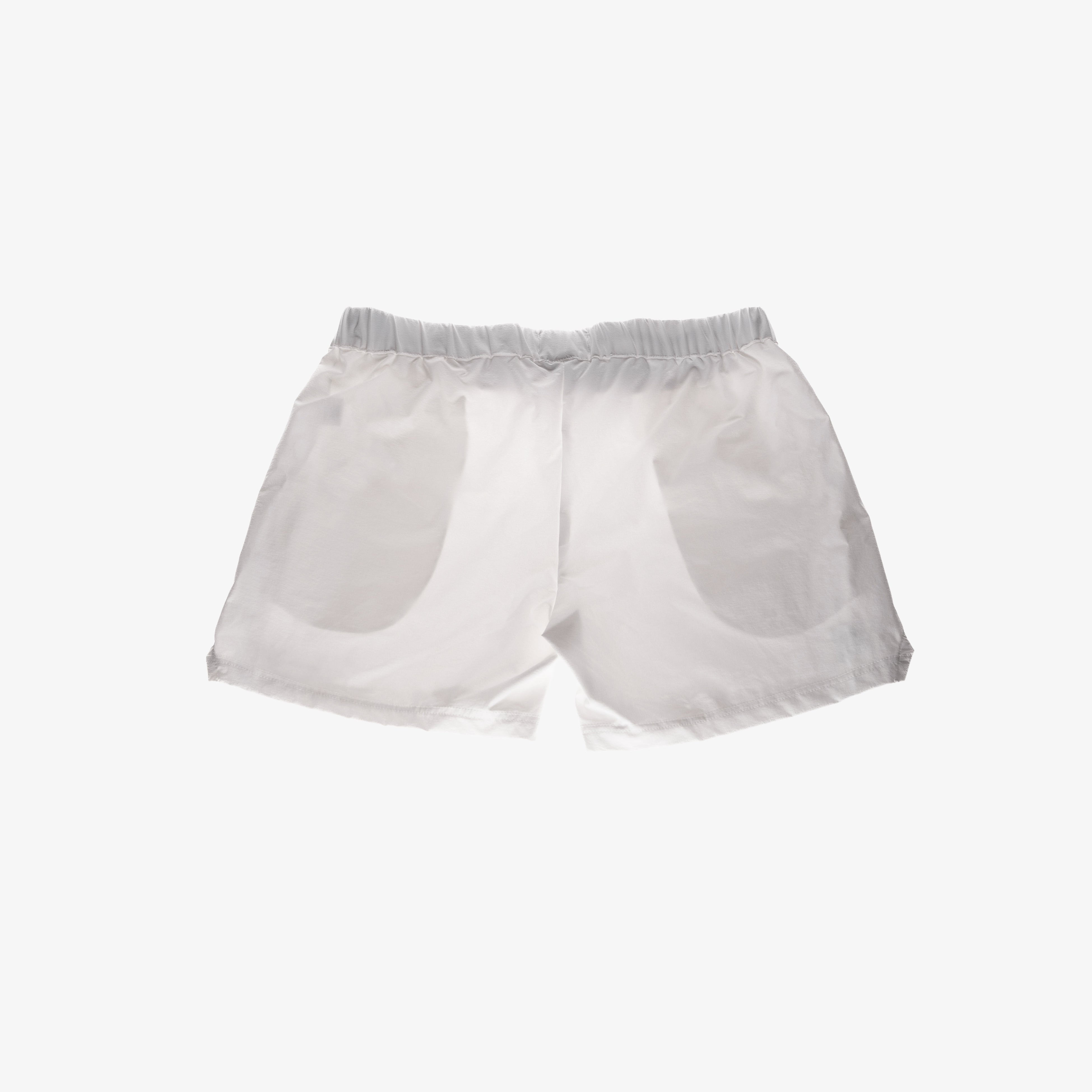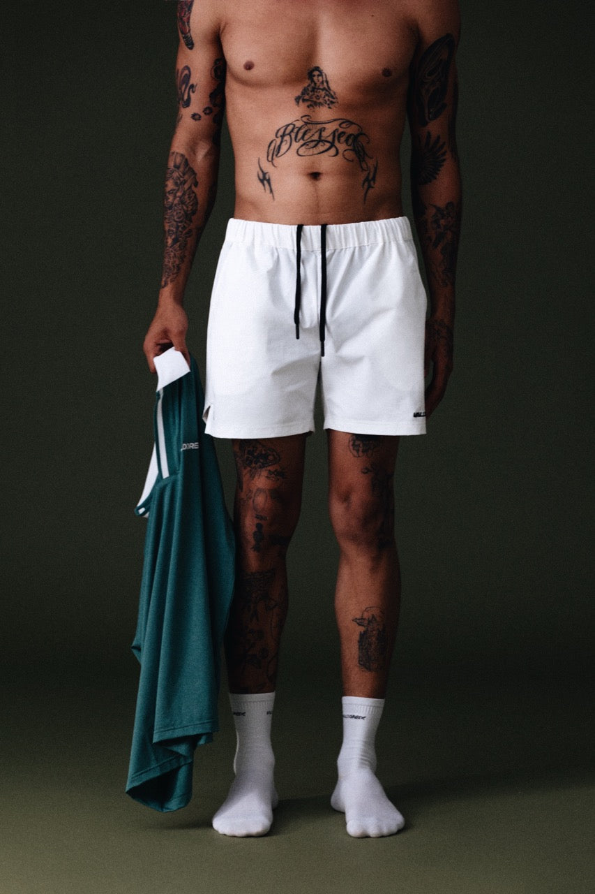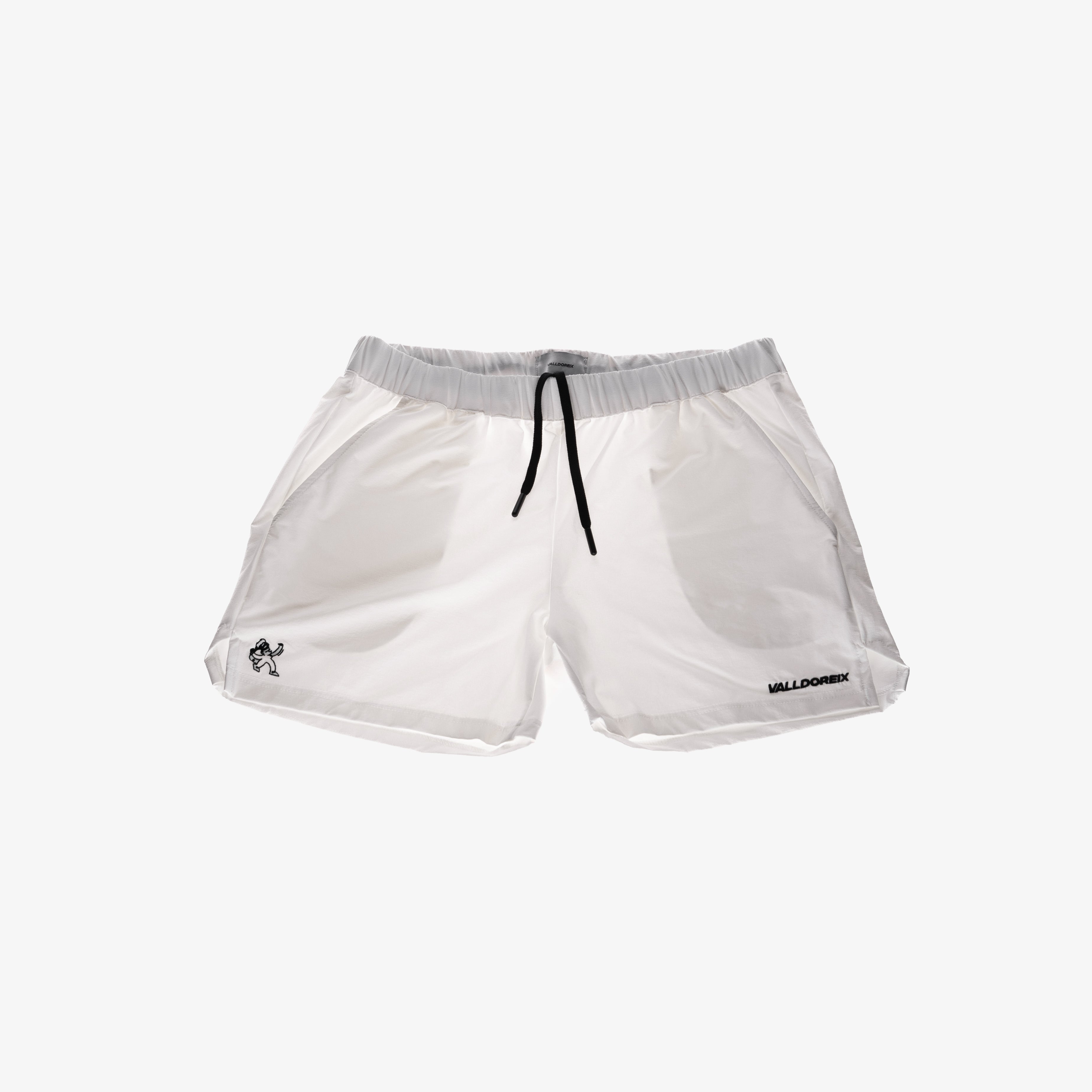 Performance shorts in pearl white with contrasting black drawstrings. Lightweight, breathable, and designed for maximum mobility on and off the tennis court. Featuring embroidered Valldoreix logos on both the bottom left and right sides for a subtle yet distinctive finish. Crafted in Key Biscayne for our FW25 collection, bringing a clean silhouette with a subtle statement detail.