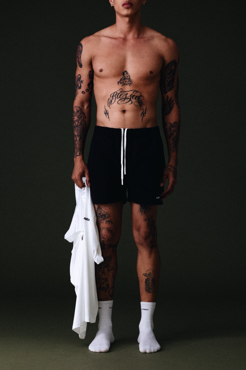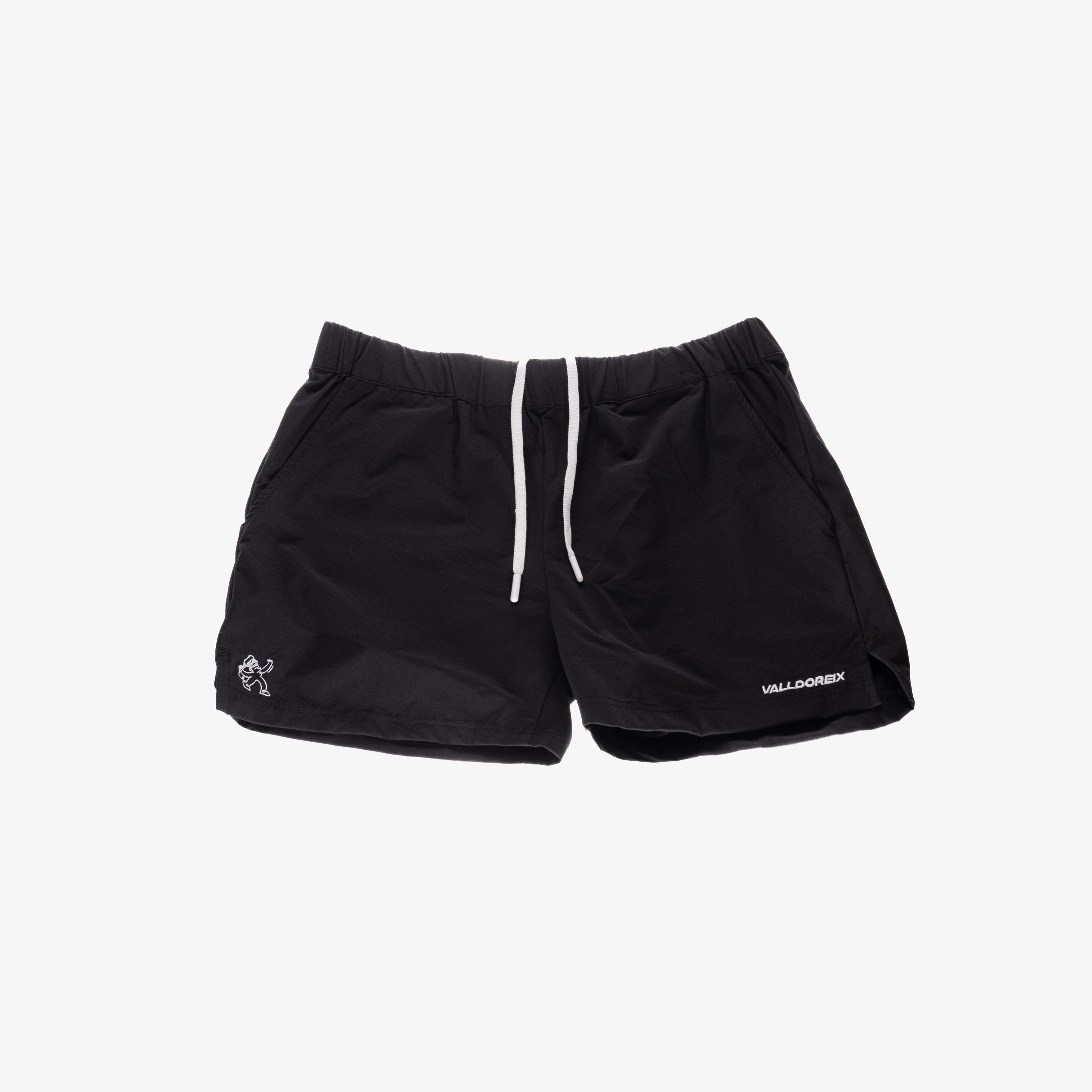 Performance shorts in black with contrasting white drawstrings. Lightweight, breathable, and designed for maximum mobility on and off the tennis court. Featuring embroidered Valldoreix logos on both the bottom left and right sides for a subtle yet distinctive finish. Crafted in Key Biscayne for our FW25 collection, bringing a clean silhouette with a subtle statement detail.