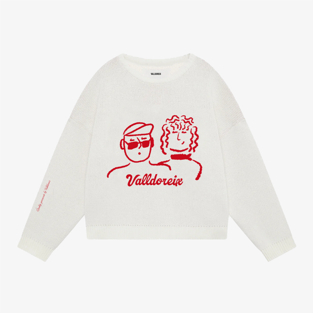 The graphic is integrated through embroidery, adding rich texture and depth to the knit, while “Quality garments by Valldoreix” is delicately embroidered on the right sleeve.